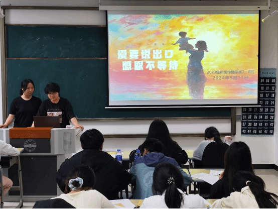 “同學們,猜一猜明天是什么節日?。俊薄澳赣H節!”5月11日,新聞傳播學類專業2023(7)、(8)班在K202教室開展以“愛要說出口,感恩不等待”為主題的團建活動?;顒娱_始前,活動負責人、新聞傳播學類專業2023(7)、(8)班的班長楊雨霏、朱研溪提前為每位同學準備好信紙和信封。朱研溪說:“我們希望通過寫信這種傳統而深情的溝通方式,讓同學們勇敢表達自己的心聲,將對母親的愛訴說于筆尖。”學生們觀看一段關于母愛的感人短片后,...